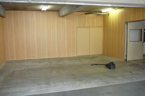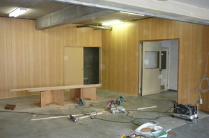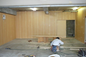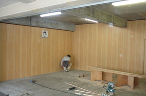 完成は1年半年後です。今回のこの工事はその期間を過ごす仮事務所の工事です。コンクリートに木造下地を作り、いざ仕上げの合板張です![]()