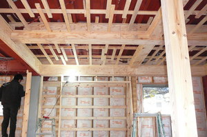 今回は1階部分が鉄骨造だったため天井高を確保するために先に内部の間仕切壁を起こして鉄骨の梁を囲い天井高を確保しました![]()