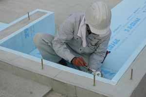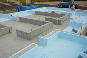 コンクリート基礎の内側に断熱材を張っていきます 今回の現場もスーパーウォール工法です
