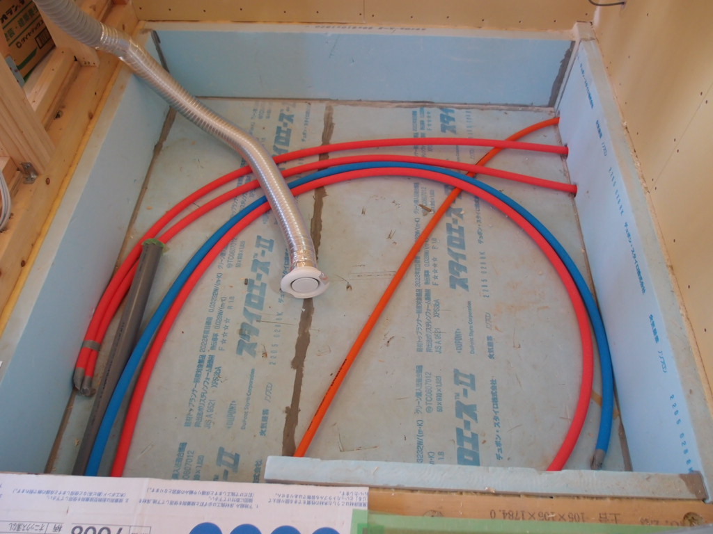 青と赤が給水と給湯、シルバーの蛇腹は換気、グレーのパイプは排水です。