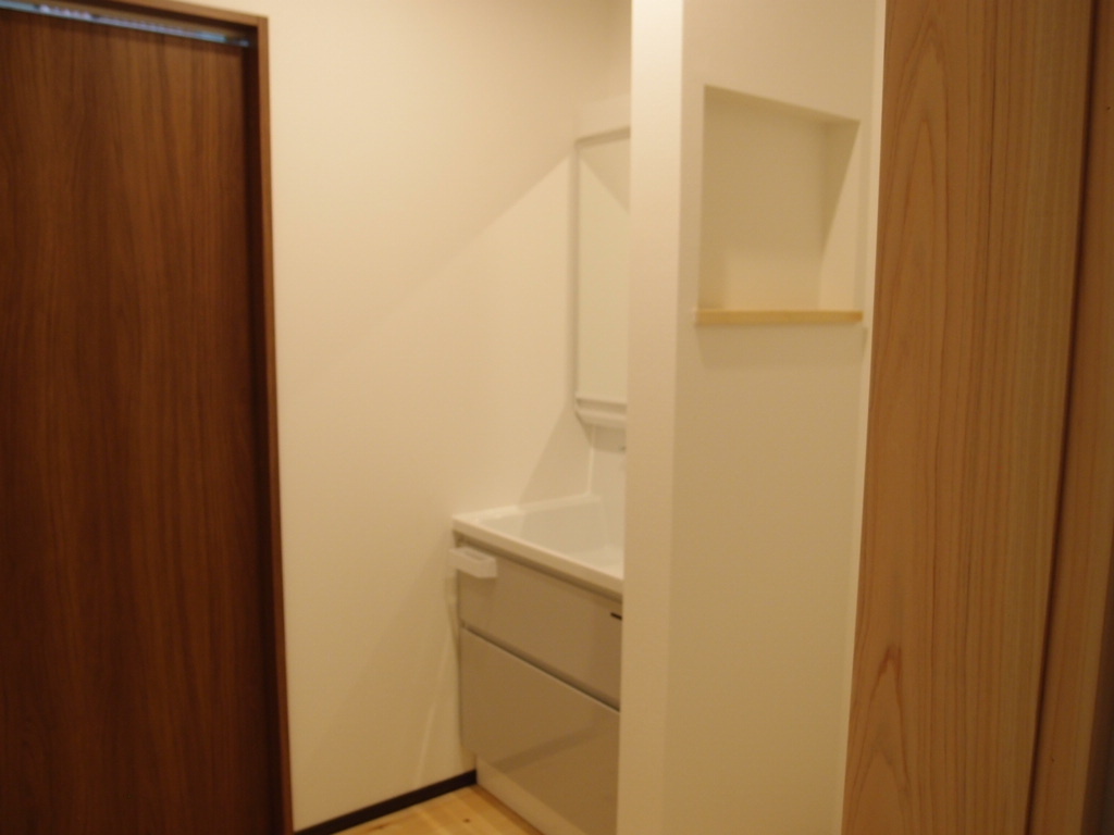洗面横に造作の棚を設け、時計などのちょっとした物置に便利にお使いいただけます。