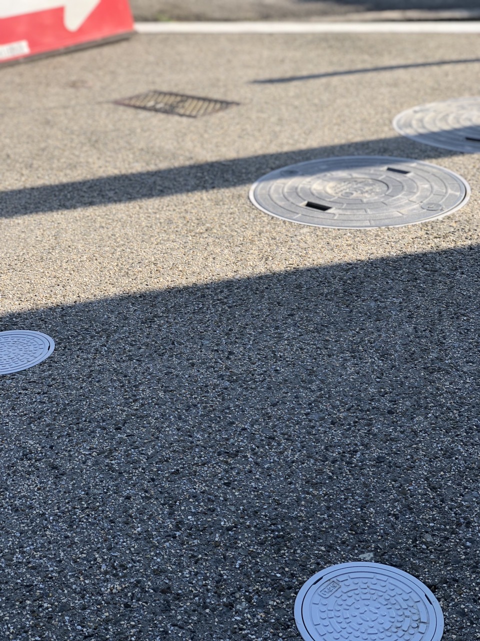 今回施工した外構では、コンクリートが硬化する前に表面を水で洗い流し、中の砂利を見せる「洗い出し」という方法で仕上げました。