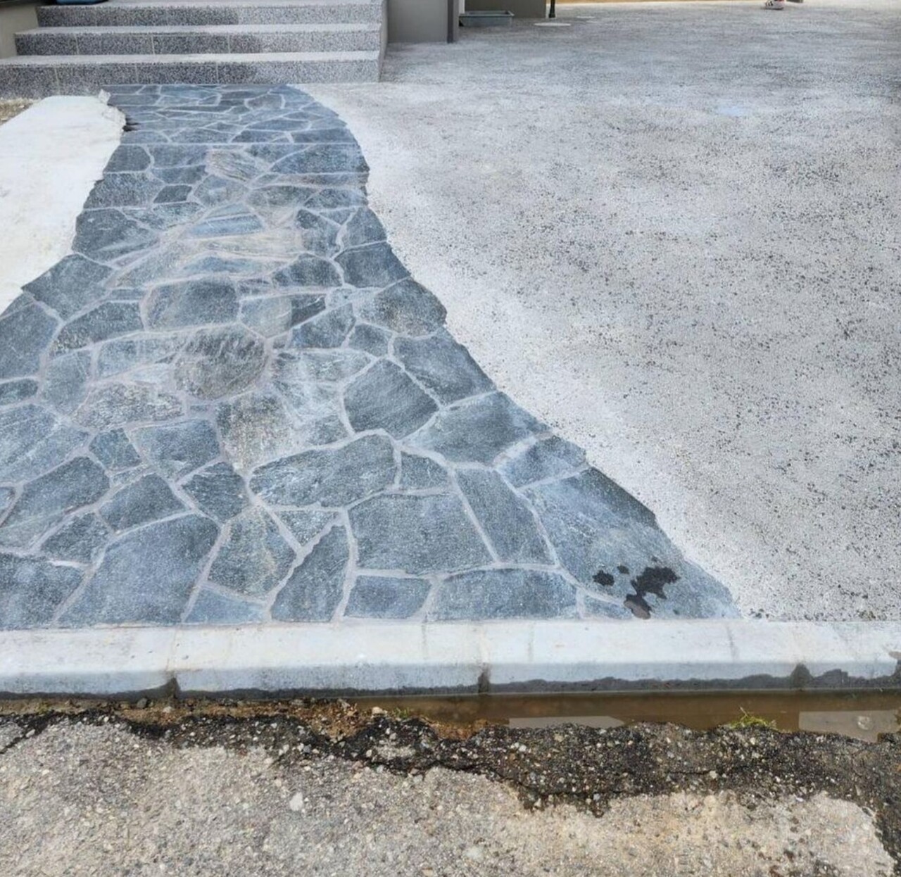 三原市:タイル乱張りと洗い出しで高級感のあるアプローチに 外構工事