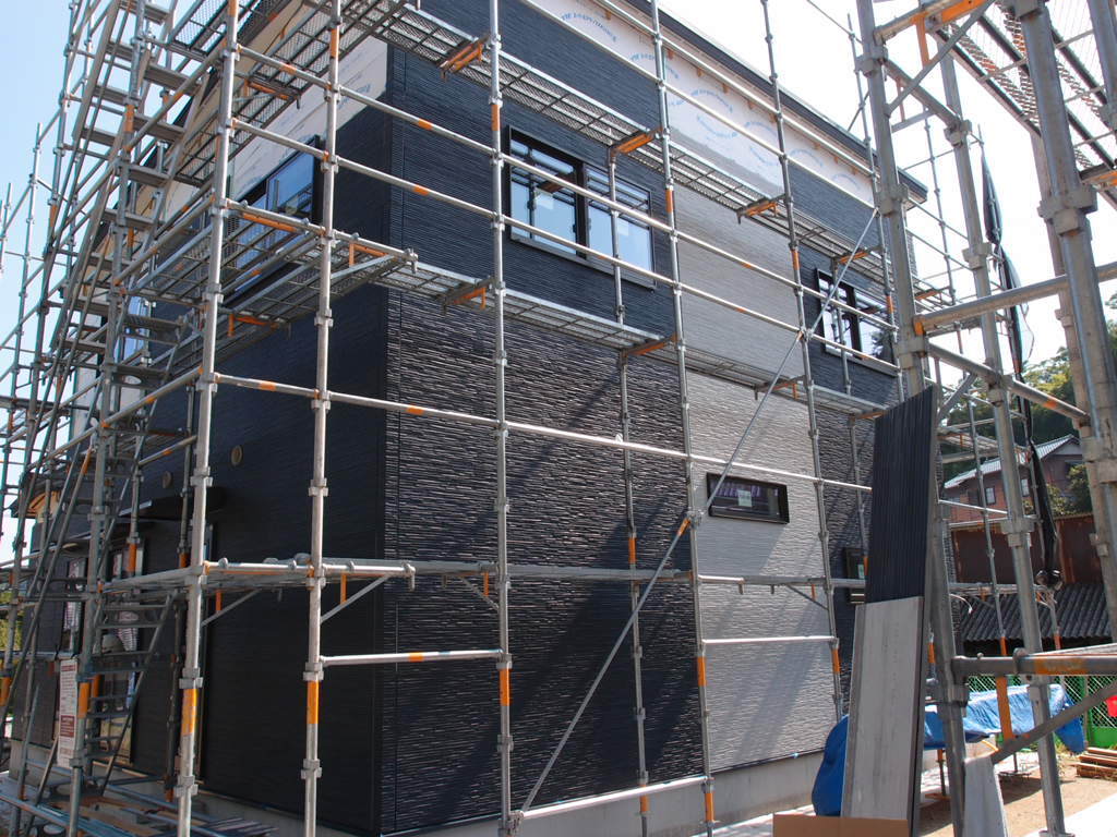 二階建てのサイディングは、奥様のこだわりでブラックとホワイトで張分けしました。