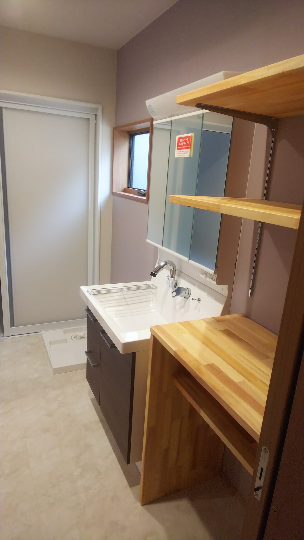 洗面台横には、家事スペースとして使えるカウンターを造作しました。