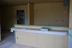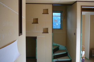 対面キッチンカウンターの設置も終え、いよいよシステムキッチンの納入待ちです  玄関ホールから3階へ続く階段上り口正面に明かりとりの窓を設け、入口左壁面には、ちょっとした壁収納を飾りつけいよいよクロス工事待ちです