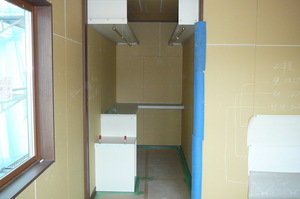 対面キッチンカウンターの設置も終え、いよいよシステムキッチンの納入待ちです  玄関ホールから3階へ続く階段上り口正面に明かりとりの窓を設け、入口左壁面には、ちょっとした壁収納を飾りつけいよいよクロス工事待ちです