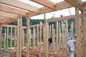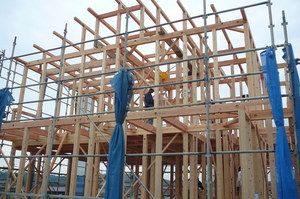 前日までには先行足場の工事を終え、軸組仕事をして雨養生を終えていざ棟上へ