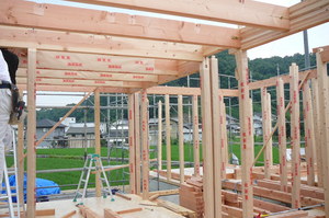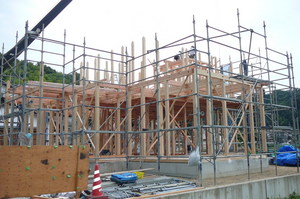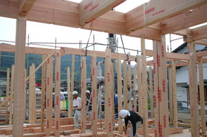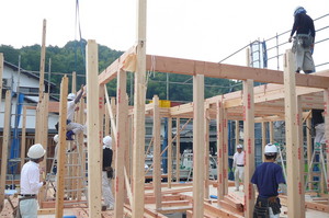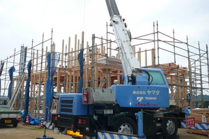 前日までには先行足場の工事を終え、軸組仕事をして雨養生を終えていざ棟上へ