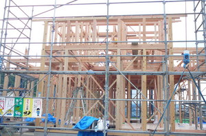 建りを起し、内部の仮筋交いもしっかりと固定していきます