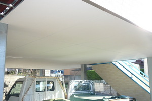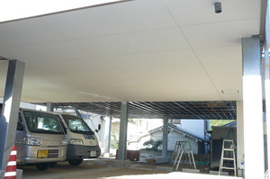 その上から不燃の天井仕上材料を張っていきます  これで剥き出しになってた鉄骨も隠れて、すっきりとしましたね~