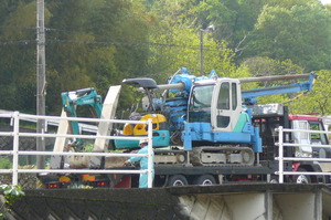 大型回送車で杭打機を搬入です。 続いてプラント車の設置を行います![]()