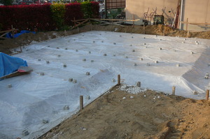 まずは外周部の掘削りを行い砕石を入れて土間シートを敷きます