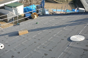 改質アスファルトルーフィングを屋根の下地の上に張り付け、縦桟と横桟を取り付けていきます