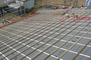 改質アスファルトルーフィングを屋根の下地の上に張り付け、縦桟と横桟を取り付けていきます