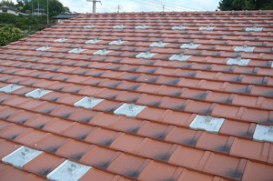 軒先から順番に瓦を並べて一枚ずつ固定していきます