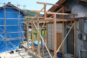 構造材の加工も終わりささやかですが増築の棟上げを行いました![]()