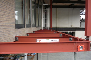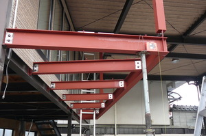 荷重と力を分散さすため、既存の鉄骨建屋の梁に吊り上げる状態で2階部分に柱を立てます