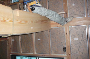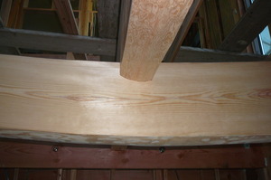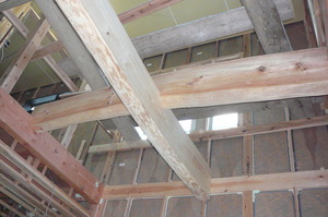 この日は吹き抜けの大空間に化粧丸太を取り付ける作業を行いました![]()