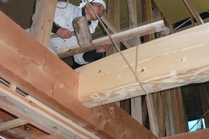 あらかじめ加工を施した部分に丸太をかけていきます