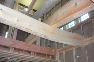 この日は吹き抜けの大空間に化粧丸太を取り付ける作業を行いました![]()