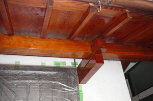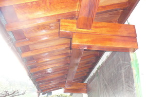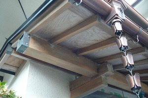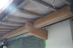 引続き尾道市A様邸外装工事 玄関廻りの壁タイルを張る前に、30年来の風化が進み黒ずんだ玄関の化粧庇を元の地松の輝きに戻す作業を行いました