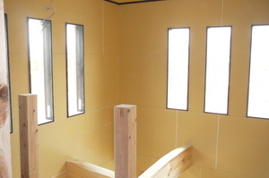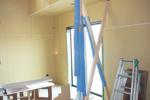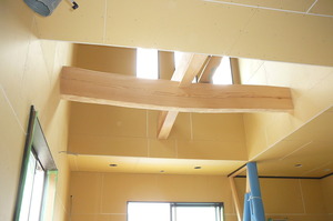 吹き抜けの壁もほぼ完成です                 アクセントの化粧丸太もいい感じです