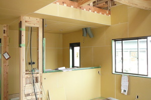 対面キッチン廻りは配線が多いためもう一度打ち合わせします  リビングの化粧筋違 ちょっとした遊び心ですね~