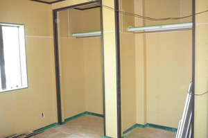 吹き抜けの壁もほぼ完成です                 アクセントの化粧丸太もいい感じです