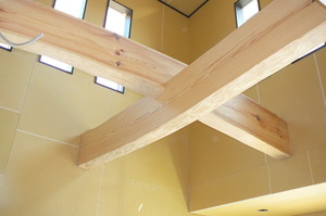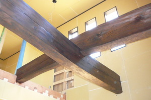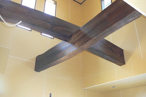クロスを貼る前に先行して吹抜けにとりつけた化粧丸太に色を付けました![]()