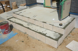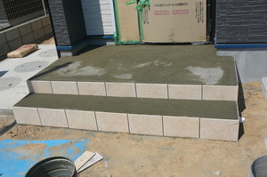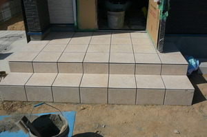 この日は玄関のタイル工事 あらかじめ作ってあった下地のコンクリートにタイルを張付けていきます