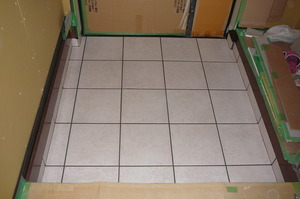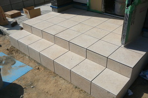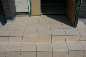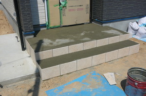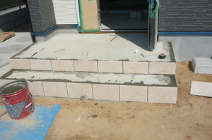 この日は玄関のタイル工事 あらかじめ作ってあった下地のコンクリートにタイルを張付けていきます