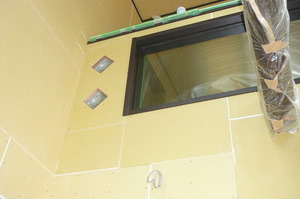吹き抜けホール部分の手すり壁の両サイドにガラスブロックをはめこんでみました![]()