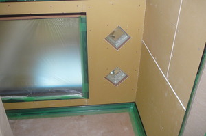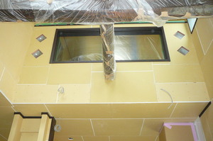 吹き抜けホール部分の手すり壁の両サイドにガラスブロックをはめこんでみました![]()
