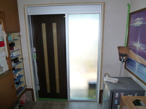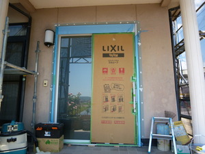 外壁の塗装工事前に玄関サッシの入れ替えです![]()