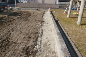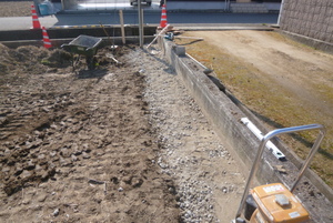 まずは周辺の境界ブロックを積むための捨コンクリート工事![]()