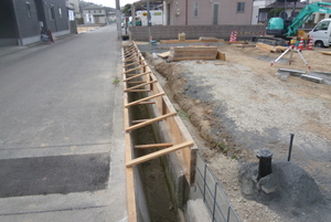 捨コンクリート、配筋工事を終え、現在擁壁型枠工事中![]()