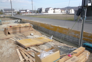 捨コンクリート、配筋工事を終え、現在擁壁型枠工事中![]()