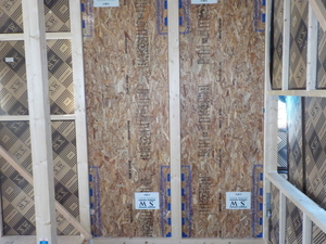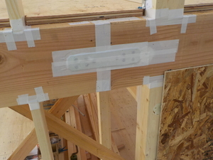 構造材の仕口や金物接合による貫通部等を気密テープなどを用いて塞いでいきます。