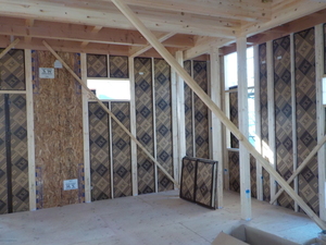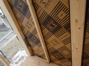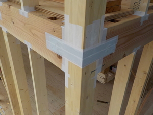 構造材の仕口や金物接合による貫通部等を気密テープなどを用いて塞いでいきます。