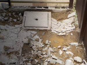 昼でもうす暗い通路の中で、まずは既存コンクリートのハツリ作業![]()