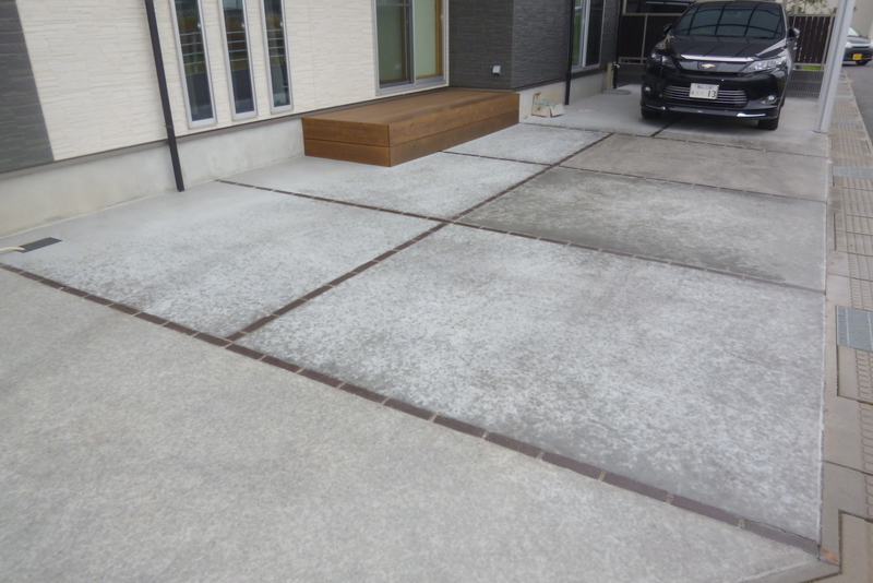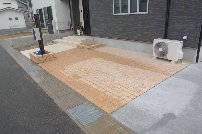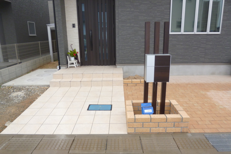 駐車場廻りは高級感のある濃い色で施工し、玄関廻りは既存の玄関タイルが明るい色合いなので、明るく可愛らしい色合いで考えた工事をしました。
